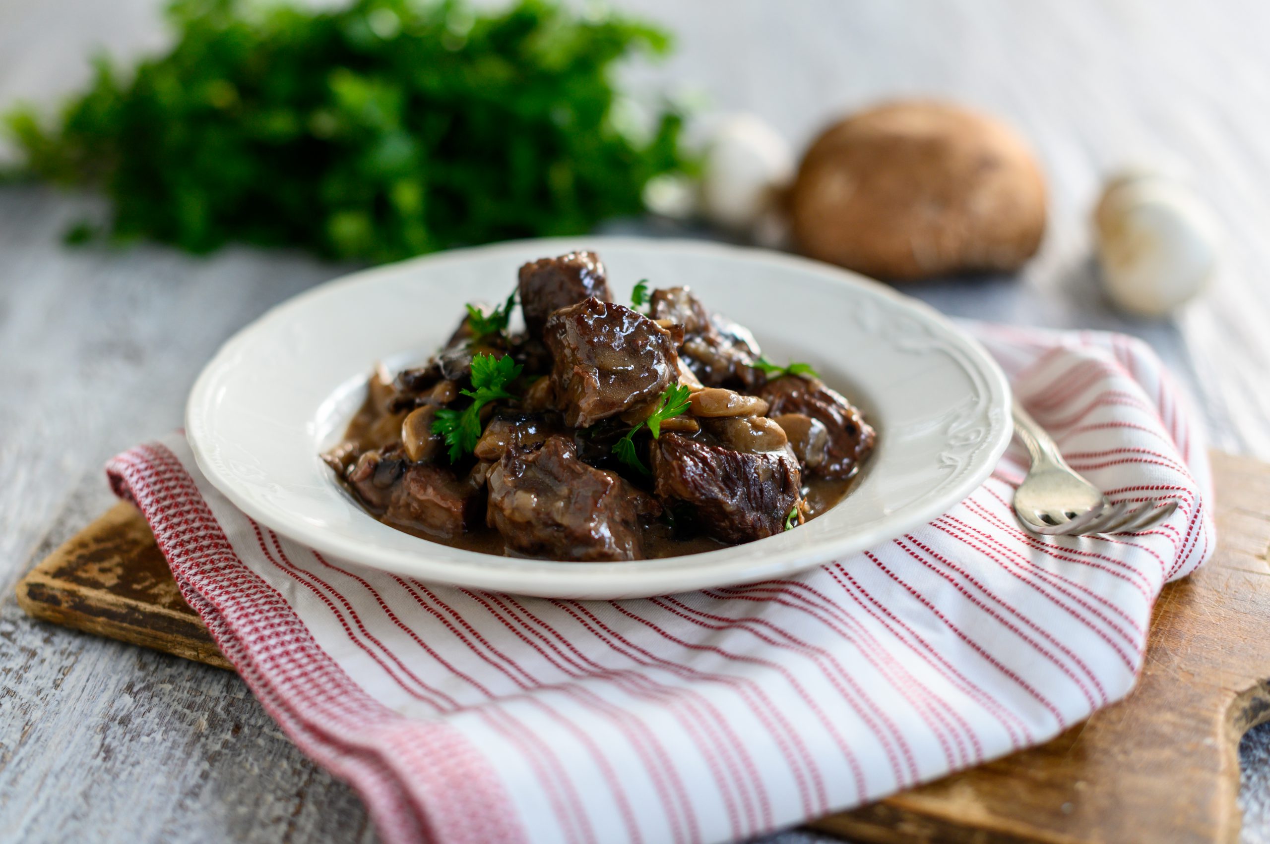 Όταν το μοσχάρι είναι έτοιμο προσθέτετε τον ψιλοκομμένο μαϊντανό, ανακατεύετε μία τελευταία φορά και σερβίρετε.