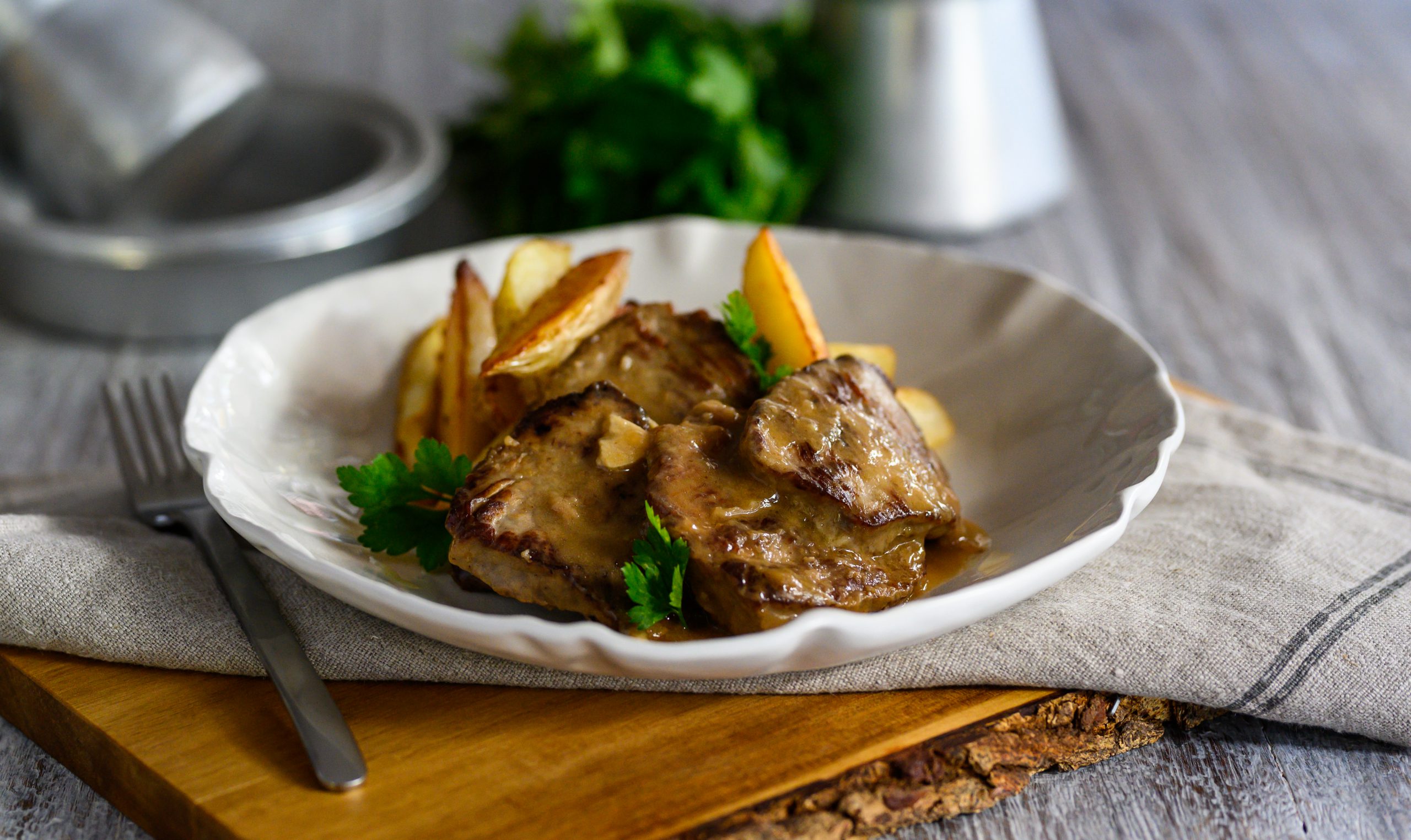 Όταν το σοφρίτο είναι έτοιμο, αποσύρετε την κατσαρόλα από την φωτιά, πασπαλίζετε με τον ψιλοκομμένο μαϊντανό και σερβίρετε σε μεγάλα ατομικά πιάτα συνοδεύοντας με πατάτες φούρνου.