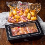 Αρνάκι γάλακτος ελευθέρας βοσκής με πατάτες φούρνου, μαριναρισμένα σε βότανα, μπαχαρικά και πιπέρια. Συσκευασμένα σε σακούλα ψησίματος, κατάλληλη για απευθείας χρήση στο φούρνο.