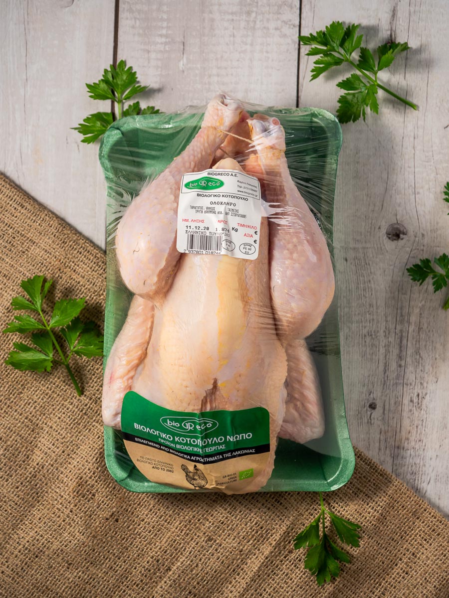 Ολόκληρο ελληνικό κοτόπουλο χωρίς εντόσθια, από παραδοσιακές φυλές χωρικού τύπου και μεγαλωμένο με 100% βιολογικές τροφές σε υπαίθριο χώρο.