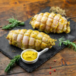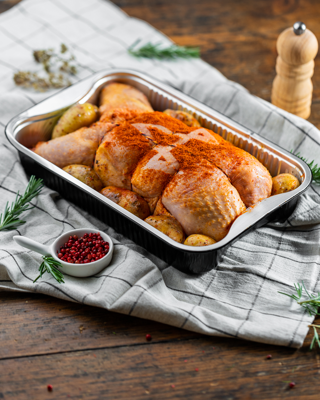 Ολόκληρο κοτόπουλο σε συσκευασία έτοιμη για ψήσιμο στο φούρνο, με πατάτες, καρυκεύματα και μαρινάδα πάπρικας και γέμιση από γραβιέρα, σαλάμι αέρος ωρίμανσης.
