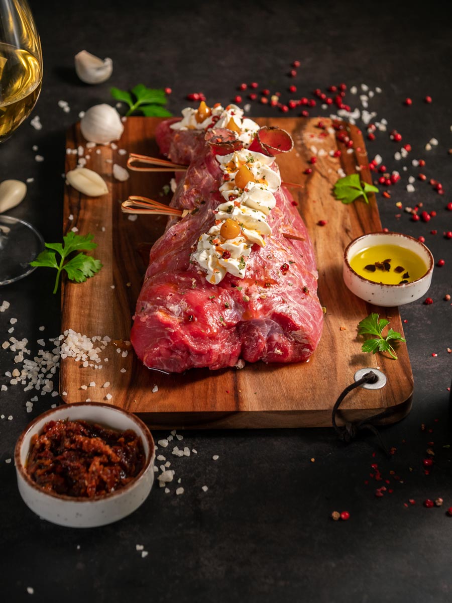 Νόστιμο κομμάτι νουά μόσχου, γεμιστό με βουτυράτη Coppa μαύρου χοίρου, μπρεζάολα και απαλό τυρί Philadelphia. Ιδανική επιλογή για νόστιμα και ιδιαίτερα πιάτα.