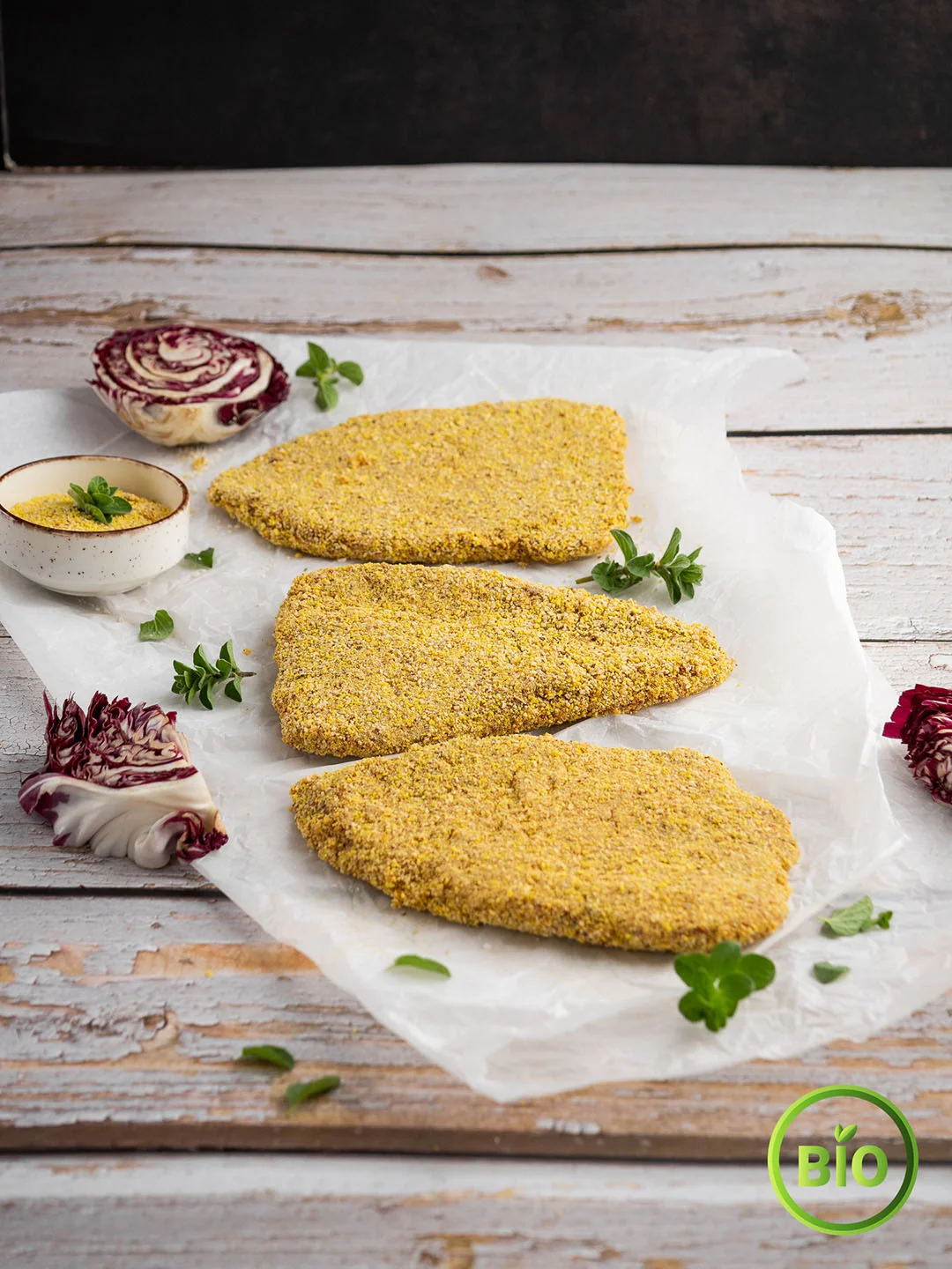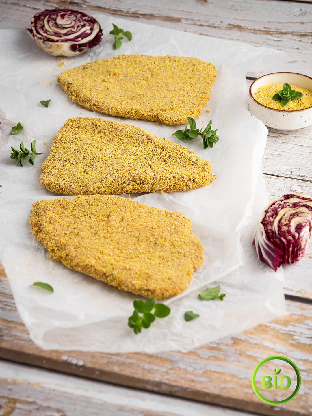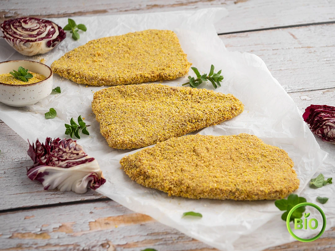 Εκλεκτό μοσχαράκι βιολογικό σε λεπτές φέτες με πανάρισμα που περιέχει ρίγανη ντομάτα ιδανικό για τηγάνι.