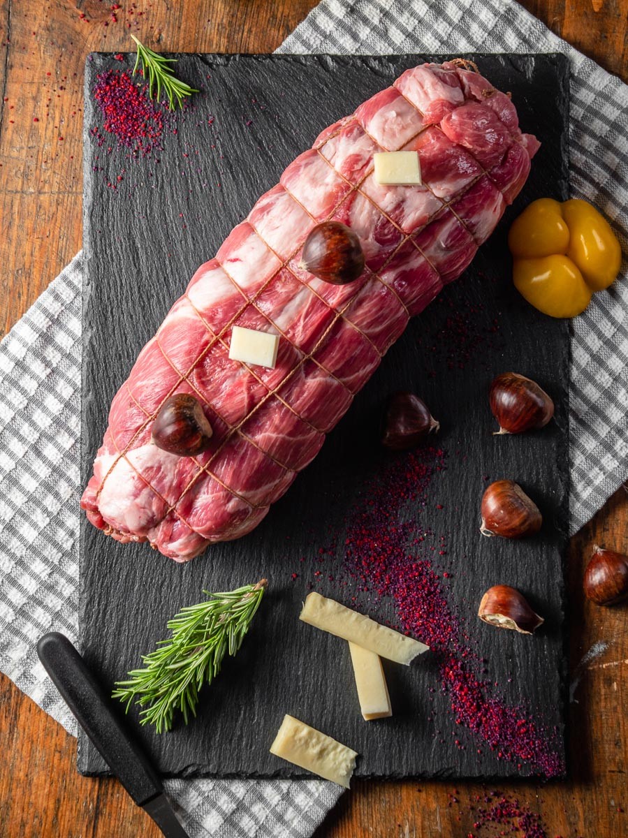 Το αγαπημένο μας ρολό, δικής μας παρασκευής, φτιαγμένο από το ξεχωριστό κρέας αυτόχθονης φυλής ελληνικού μαύρου χοίρου. Γεμιστό με κάστανα και γραβιέρα Ιωαννίνων. Ιδανικό για τα Κυριακάτικα, οικογενειακά και εορταστικά σας τραπέζια.Επιλέξτε το βάρος του ρολού σας και εμείς θα το φτιάξουμε για εσάς.