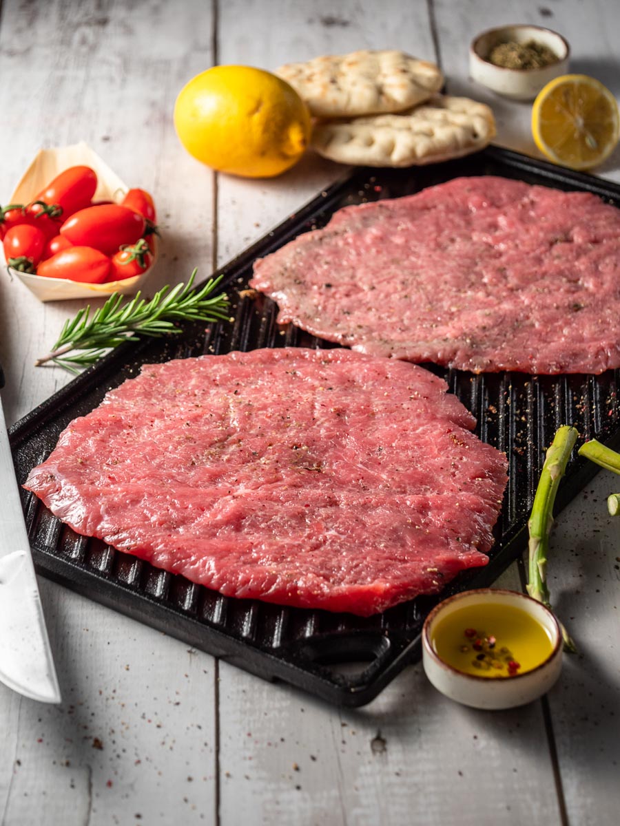 Νόστιμο μοσχαρίσιο σνίτσελ, με νόστιμη μαριναρινάδα από ποικιλία τριών ροζ πιπεριών, πιπεριές και λάδι. Από μοσχάρι ελευθέρας βοσκής, μεγαλωμένο στις φάρμες μας στην Ήπειρο.
