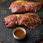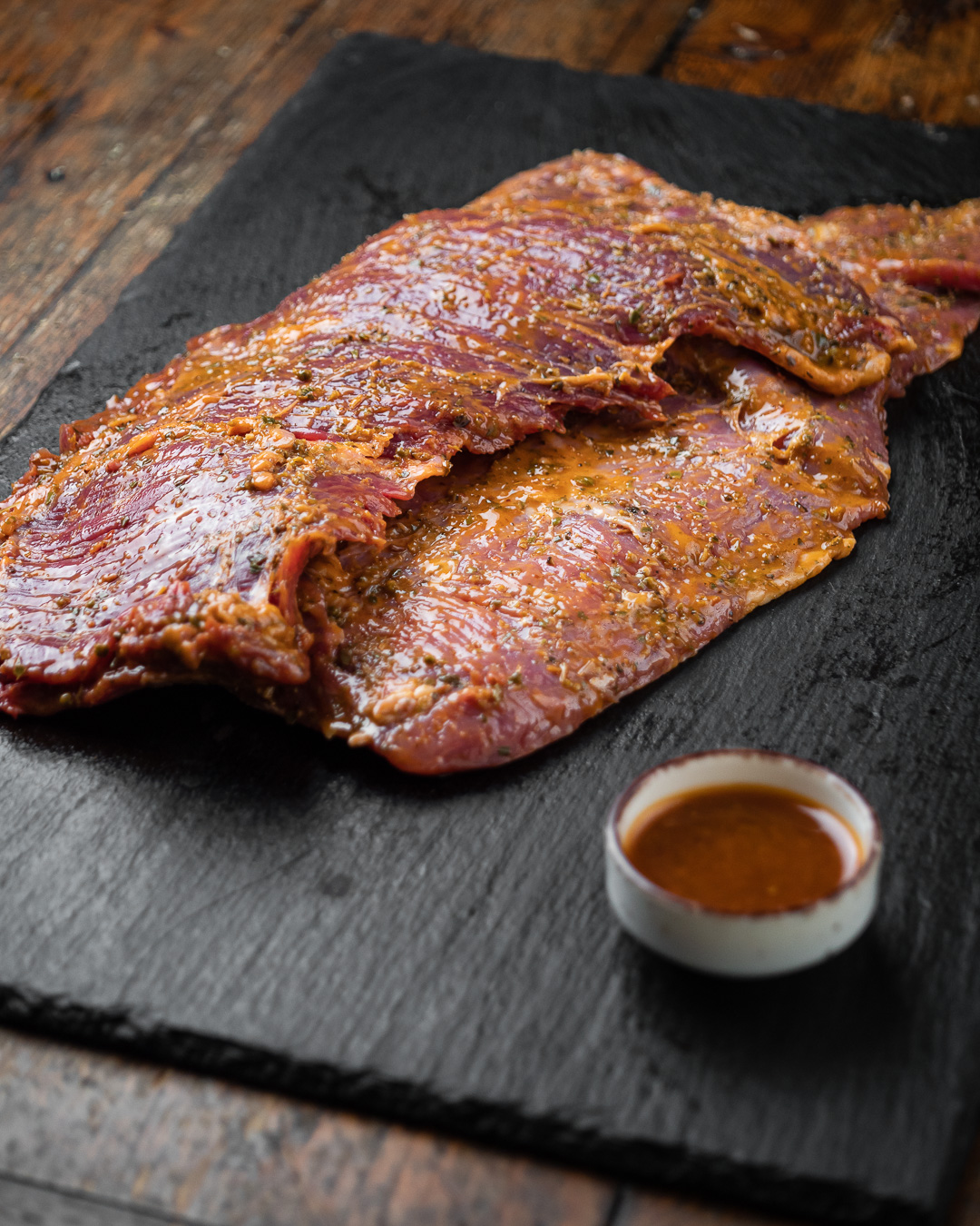 Με λεπτό πάχος (σχεδόν 1 εκ.) το skirt είναι μια από τις πιο νόστιμες κοπές μοσχαρίσιου κρέατος για ψήσιμο στη σχάρα ή το φούρνο. Μαρινάρεται σε sauce με γλυκιά και καπνιστή πάπρικα, λάδι και αλατοπίπερο.