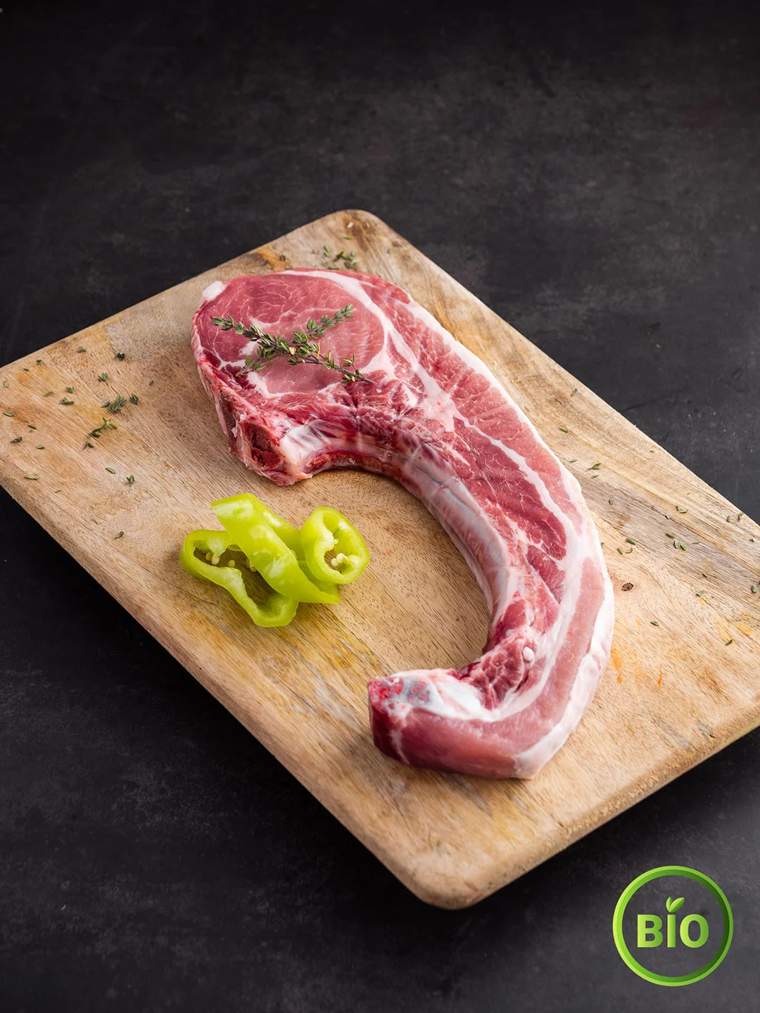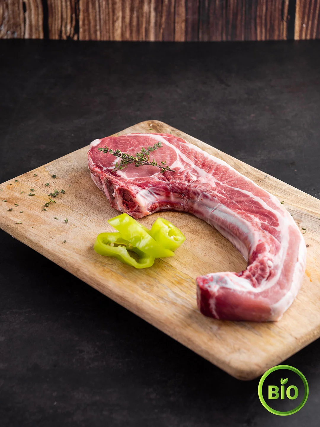 Ζουμερή μπριζόλα με πανσετα χοιρινή βιολογική για μπάρμπεκιου βάρος περίπου 1kg.